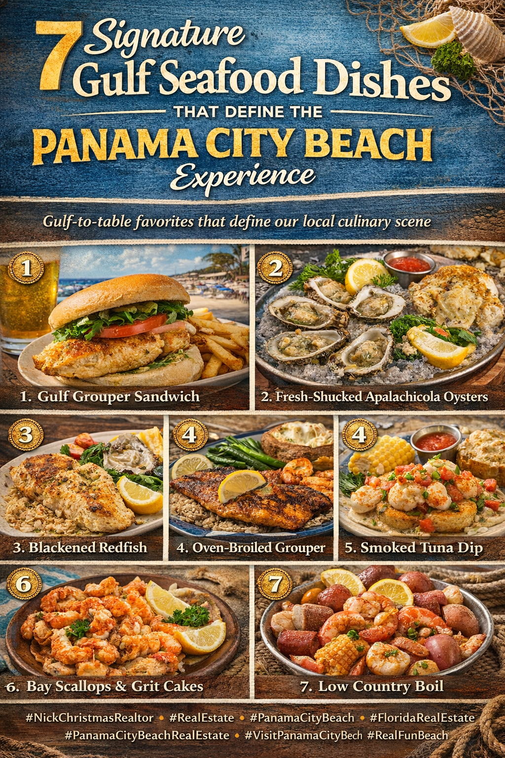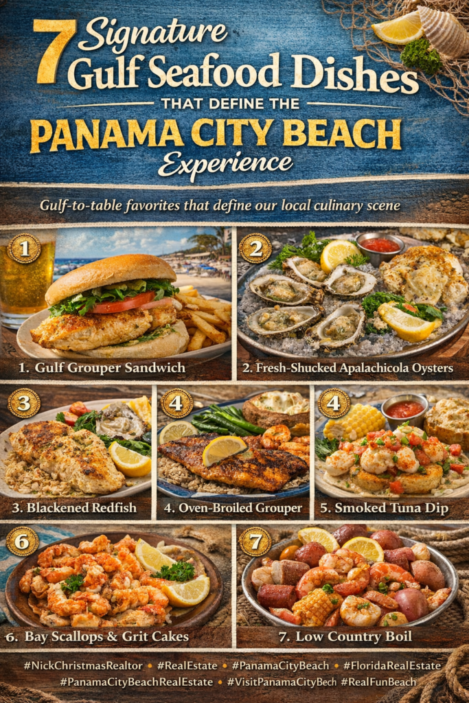 7 Signature Gulf Seafood Dishes That Define the Panama City Beach Experience — from fresh Gulf grouper sandwiches and Apalachicola oysters to blackened redfish, smoked tuna dip, bay scallops with grit cakes, and a classic Low Country boil.